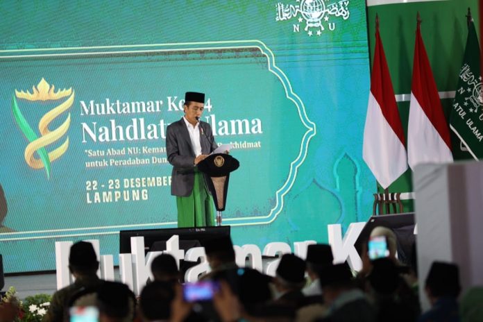 Presiden Joko Widodo (Jokowi) mengapresiasi kontribusi Nahdhatul Ulama (NU) pada kegiatan Muktamar NU ke-34 yang digelar di Pondok Pesantren Darus Sa’adah, Lampung Tengah Rabu (22/12/2021)