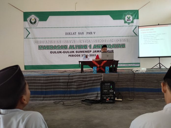 Hal itu disampaikan langsung oleh Bapak Nurul Hidayat dalam materi ‘Pertolongan Pertama’ pada kegiatan Pendidikan dan Pelatihan Dasar (Diklatsar) Ke-5 yang diselenggarakan oleh Palang Merah Remaja (PMR) Organisasi Siswa Intra Sekolah (Osis) Madrasah Aliyah (MA) 1 Annuqayah Guluk-Guluk Periode 2021-2022, Rabu (09/02/2022) di aula setempat.