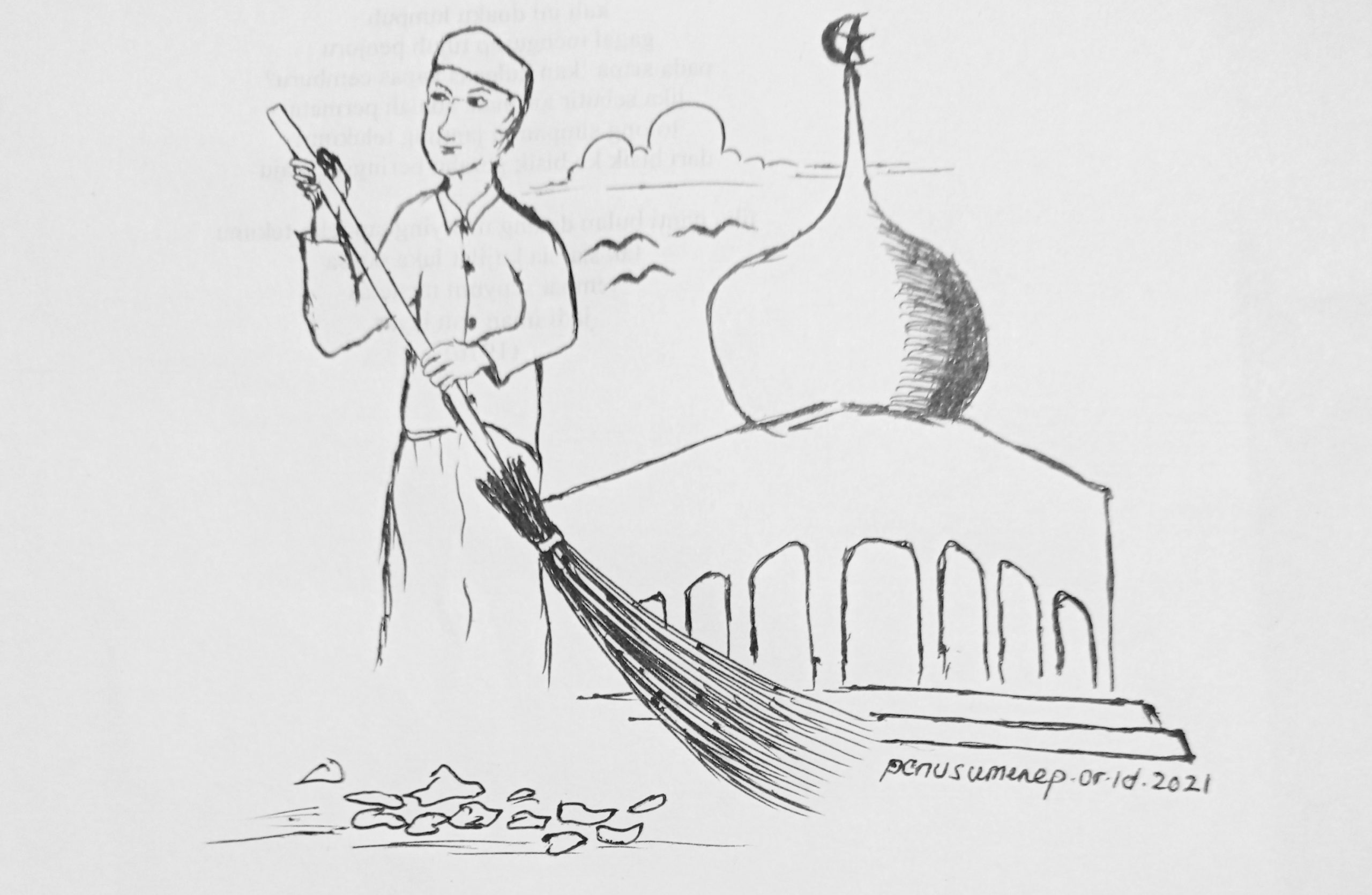 Seperti biasa, sehabis salat, Kang Mus mengambil sapu dan segera membersihkan halaman masjid. Sebagian daun-daun yang berserakan dipungutnya satu per satu. Debu dan kotoran yang mengotori halaman masjid dia sapu sampai bersih, sehingga jamaah yang salat merasa asri dengan lingkungan masjid. Sesudah membersihkan pelataran masjid dia segera mengambil ember dan berjalan untuk mengambil air di sumur belakang masjid. Tenaganya seperti saat masih usia muda walaupun umurnya sudah tidak muda lagi.