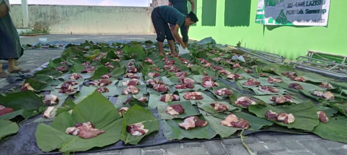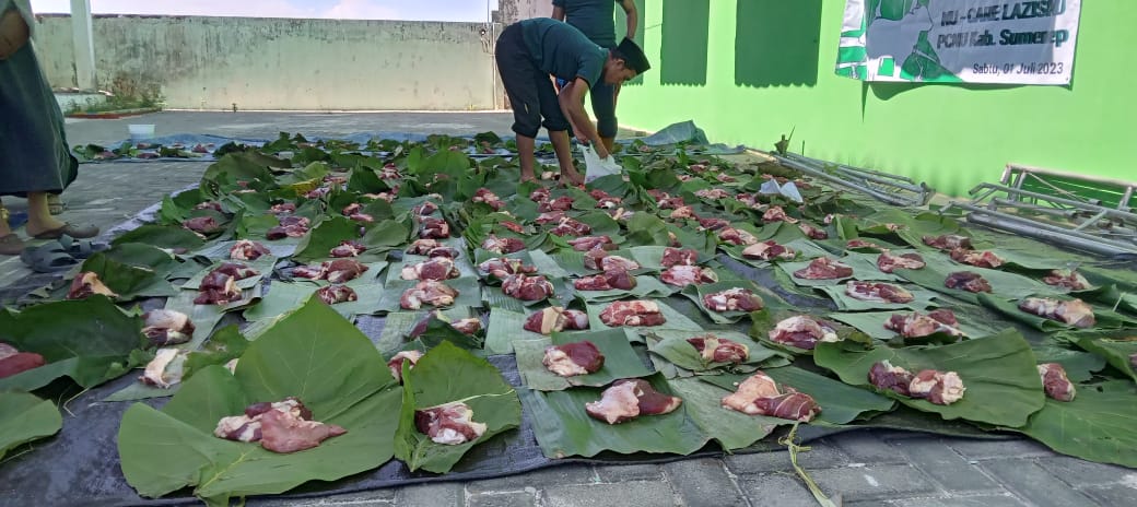 Setiap momen Idul Adha, tidak lepas dengan pemotongan hewan kurban. Yang lumrah di lapangan, pendistribusian daging dibungkus ke kantong plastik oleh panitian. Namun Pengurus Cabang (PC) NU Care-Lembaga Amil Zakat, Infaq dan Shadaqah Nahdlatul Ulama (LAZISNU) Sumenep membungkus daging dengan daun jati dan pisang.