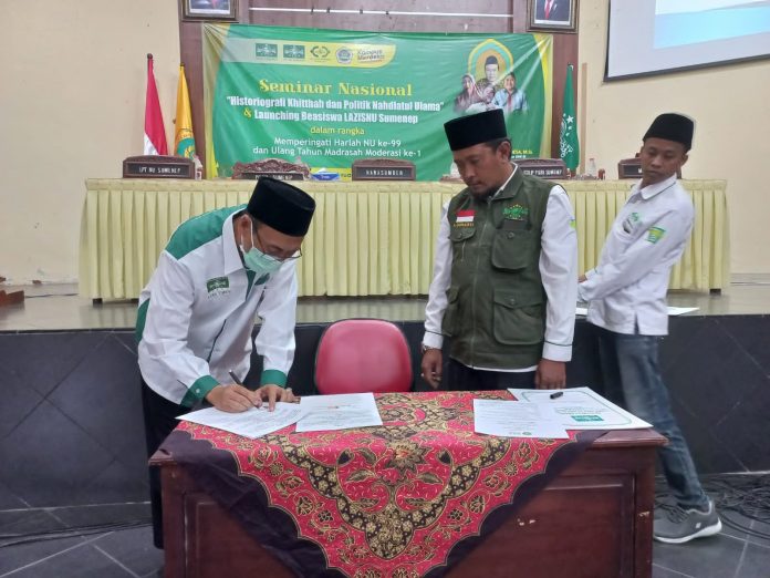 Memperingati Hari Lahir (Harlah) NU Ke-99, Lembaga Pendidikan Tinggi Nahdlatul Ulama (LPT NU) dan NU Care Lembaga Amil Zakat Infaq dan Shadaqah Nahdlatul Ulama (LAZISNU) Sumenep menandatangani nota kesepahaman terkait penyaluran beasantri dengan lima perguruan tinggi di Kabupaten Sumenep, Ahad (6/2/2022).