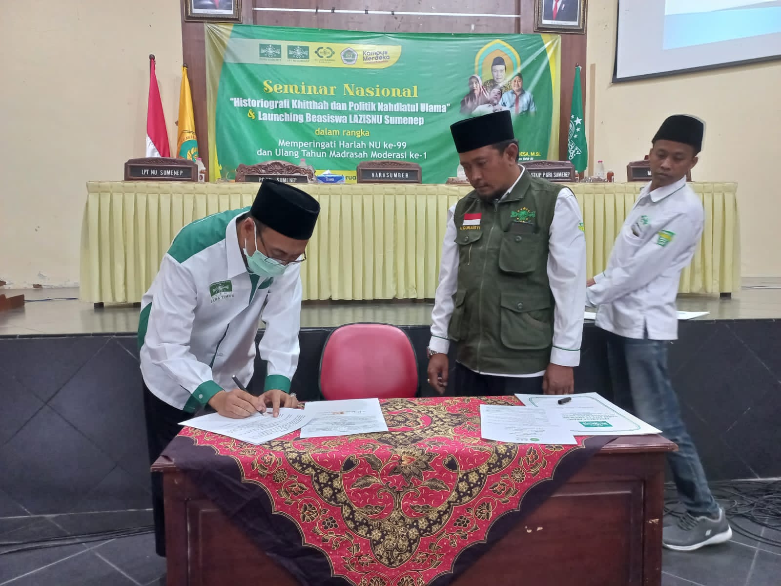 Penandatangan Memorandum of Understanding (MoU) ini dilakukan saat acara Seminar Nasional ‘Historiografi Khitthah dan Politik Nahdlatul Ulama’ dan Launching Beasiswa LAZISNU Sumenep dalam rangka Memperingati Harlah NU Ke-99 dan Ulang Tahun Madrasah Moderasi ke-1. Bertempat di Graha Kemahasiswaan Sekolah Tinggi Keguruan dan Ilmu Pendidikan (STKIP) Persatuan Guru Republik Indonesia (PGRI) Sumenep.