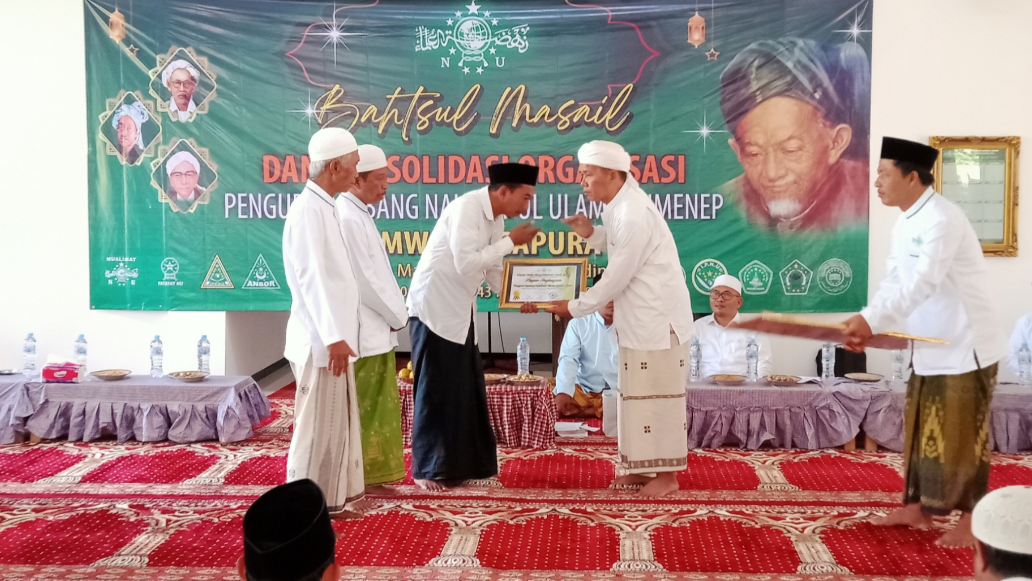 Secara simbolik, Rais PCNU Sumenep, KH. Hafidhi Sarbini menyerahkan cenderamata dan penghargaan kepada perwakilan PRNU Gapura Timur.