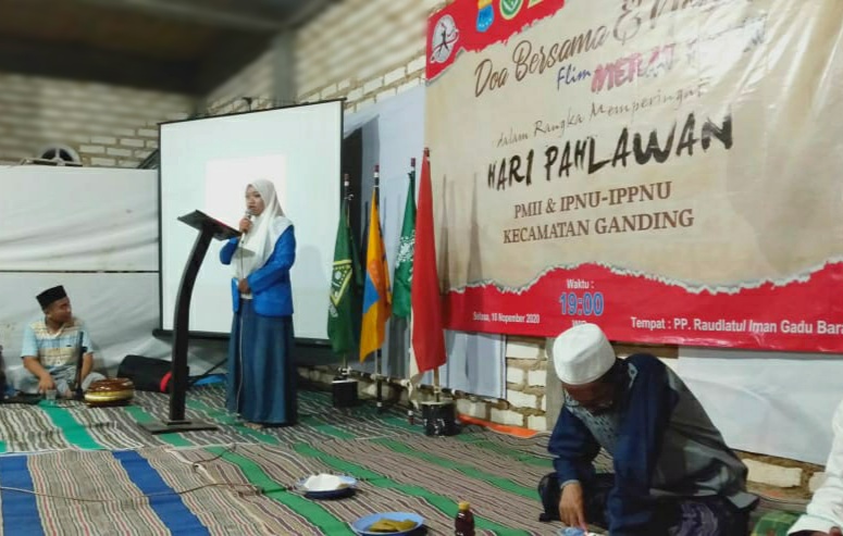 10 November merupakan Hari Pahlawan yang menjadi hari nasional. Untuk mengenang jasa pahlawan, Pergerakan Mahasiswa Islam Indonesia (PMII) bekerjasama dengan Pimpinan Anak Cabang (PAC) Ikatan Pelajar Nahdlatul Ulama (IPNU) dan Ikatan Pelajar Putri Nahdlatul Ulama (IPPNU) Kecamatan Ganding, menggelar Doa bersama dan Pemutaran Film ‘Merah Putih’. Acara tersebut dilaksanakan di Pondok Pesantren Raudhatul Iman, Gadu Barat, Ganding, Sumenep, Selasa (10/11/2020) malam.