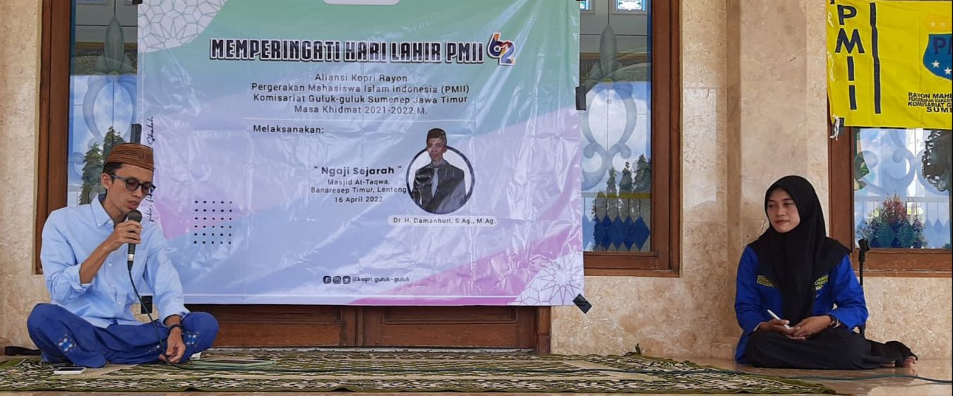 Demikian penjelasan H Damanhuri saat mengisi kegiatan ngaji sejarah dengan ‘Membaca Ulang Sejarah PMII: Aksi, Negosiasi dan Polariasi’ yang diselenggarakan oleh Aliansi Kopri Rayon PMII Komisariat Guluk-Guluk, Sabtu (16/04/2022) di Masjid At-Taqwa Banaresep Timur, Lenteng.