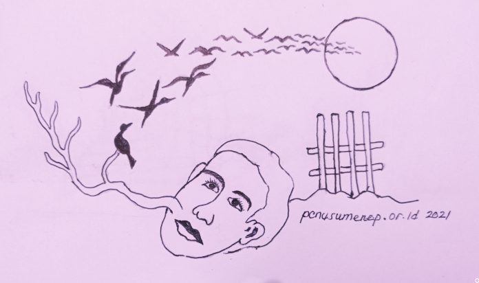 Aku terbahak, mana mungkin orang yang sudah jelas-jelas meninggal akan kembali mengembuskan napas. Kecuali, jika ia mengadakan perjanjian dengan Tuhan, atau mungkin malaikat agar ketika sesudah dikubur nafasnya dikembalikan. Hal itu mustahil, tetapi ayah satu-satunya orang yang percaya. Aku justru merasa kasihan kepada kakek kalau benar napasnya bisa kembali utuh perantara daun yang berjumlah tujuh. Sebab, di sana, ia tidak menemukan siapa-siapa kecuali kesepian yang semakin hari semakin liar.