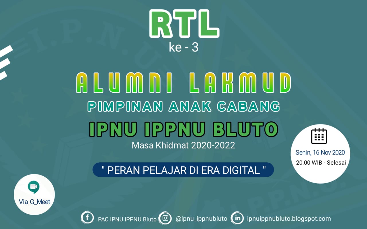 Dalam rangka memaksimalkan potensi-potensi kader di tengah maraknya arus globalisasi, Pimpinan Anak Cabang (PAC) Ikatan Pelajar Nahdlatul Ulama (IPNU) dan Ikatan Pelajar Putri Nahdlatul Ulama (IPPNU) Kecamatan Bluto, kembali mengadakan Diskusi Online yang bertemakan ‘Peran Pelajar Di Era Digital’, Senin (16/11/2020) malam.